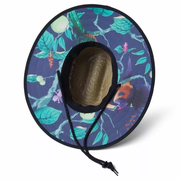 Long brimmed handwoven pipe straw hat (derived from grass) with a printed polyester lined brim, embroidered patch on front, binding on brim edge, adjustable chinstrap with cord lock thread through antique brass eyelets, interior moisture absorbing sweatband.