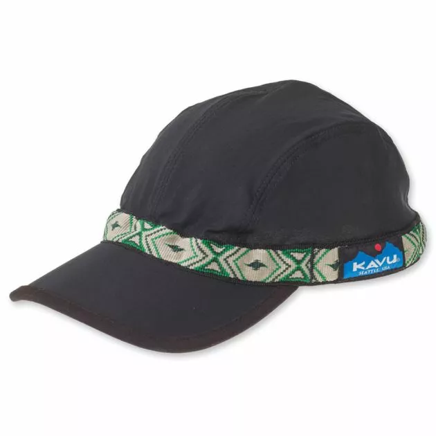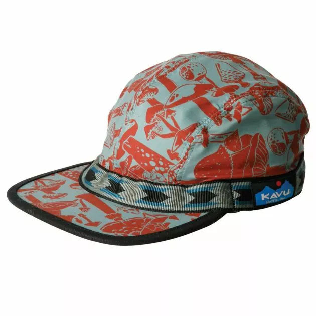 This hat features a low profile 4-panel design, has a black underbill to reduce glare and has patterned nylon tubular webbing with KAVU adjustment.