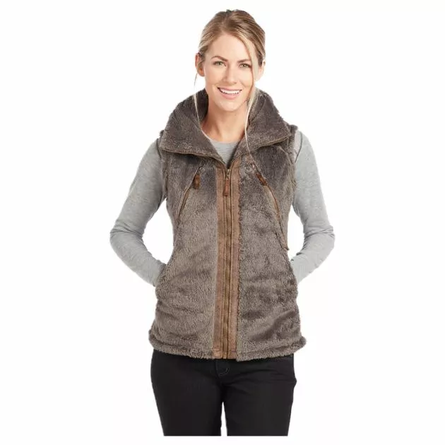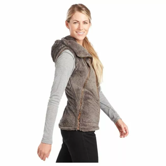 Cover yourself in soft, plush, luxurious warmth in the Kuhl Women’s Flight Fleece Vest. Premium Italian mid-weight two-toned polyester fleece gives the Flight Vest a super-cozy feel and a textured depth of color that looks as good as it feels. A fashion-forward design features a high collar and four zippered pockets that contribute to the vest’s distinctive style. The supremely soft hood feels nice and cozy and zips away into the collar when not needed. Vintage micro-suede accents elevate the Flight into the next level of style and design