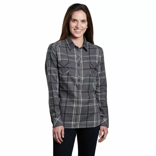 Cozy up fireside in the Kuhl Keva Flannel. The Keeva pullover features a soft cotton blend fabric for comfort and warmth. With velvet detail on the side seams, curved hem and strategically placed darts for a better fit, this pullover flannel is feminine and flattering.